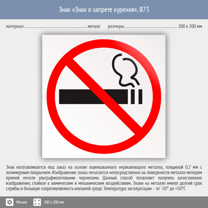 Знак «Знак о запрете курения», B73 (металл, 200х200 мм) в Химках купить