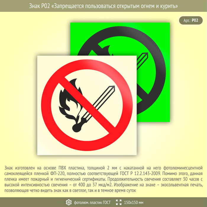 Знак P02 «Запрещается пользоваться открытым огнем и курить» (фотолюминесцентный пластик ГОСТ 34428-2018, 150х150 мм) в Химках купить