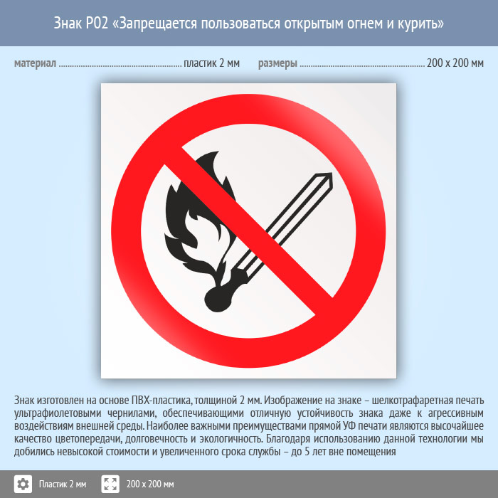 Знак P02 «Запрещается пользоваться открытым огнем и курить» (пластик, 200х200 мм) в Химках купить