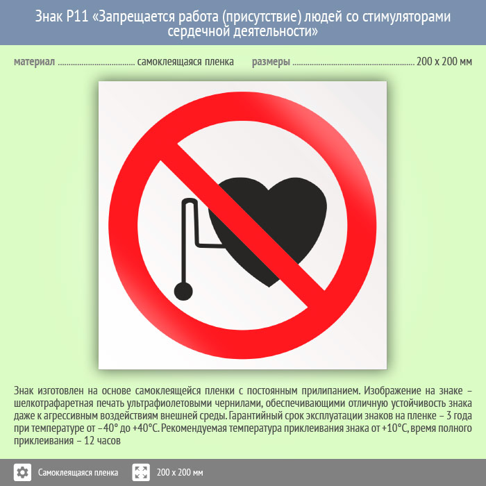 Знак P11 «Запрещается работа (присутствие) людей со стимуляторами сердечной деятельности» (пленка, 200х200 мм) в Химках купить