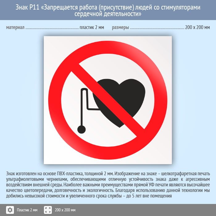 Знак P11 «Запрещается работа (присутствие) людей со стимуляторами сердечной деятельности» (пластик, 200х200 мм) в Химках купить
