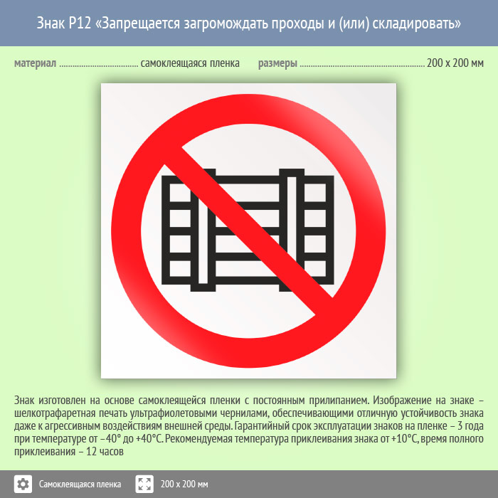 Знак P12 «Запрещается загромождать проходы и (или) складировать» (пленка, 200х200 мм) в Химках купить