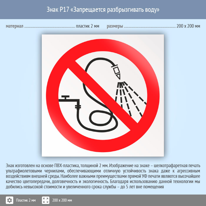 Знак P17 «Запрещается разбрызгивать воду» (пластик, 200х200 мм) в Химках купить