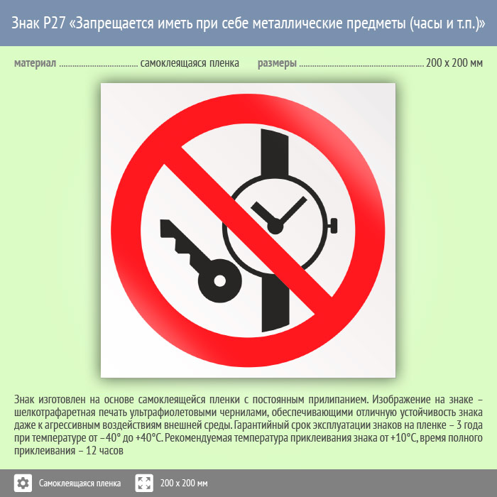 Знак P27 «Запрещается иметь при (на) себе металлические предметы (часы и т.п.)» (пленка, 200х200 мм) в Химках купить