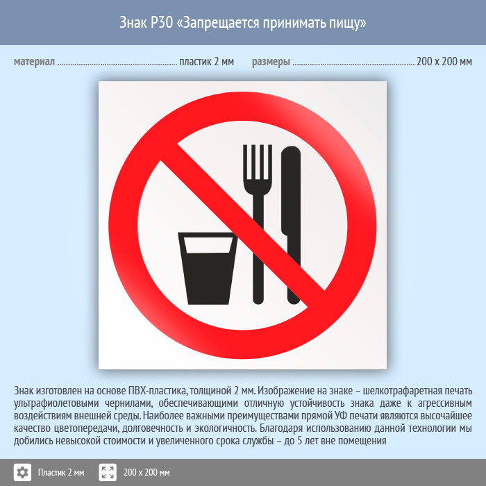 Знак P30 «Запрещается принимать пищу» (пластик, 200х200 мм) в Химках купить