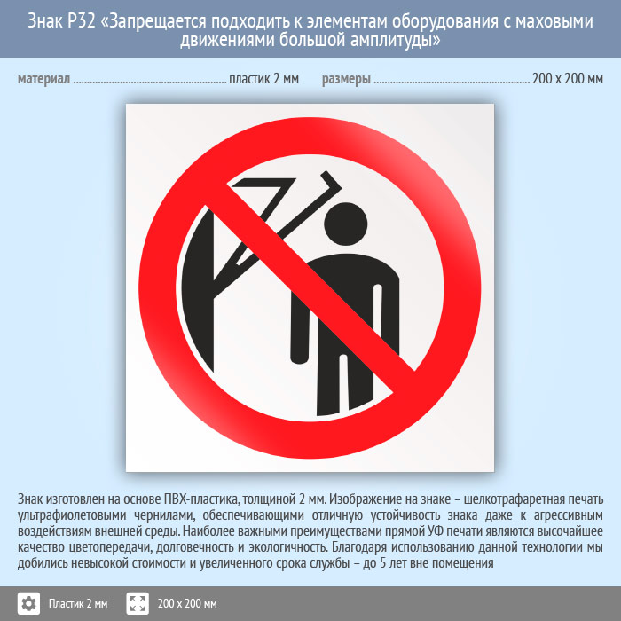 Знак P32 «Запрещается подходить к элементам оборудования с маховыми движениями большой амплитуды» (пластик, 200х200 мм) в Химках купить