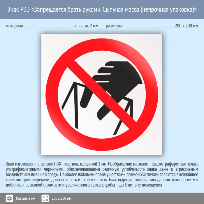 Знак P33 «Запрещается брать руками. Сыпучая масса (непрочная упаковка)» (пластик, 200х200 мм) в Химках купить