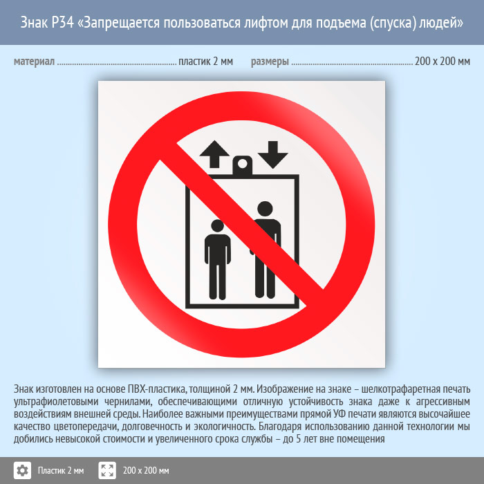 Знак P34 «Запрещается пользоваться лифтом для подъема (спуска) людей» (пластик, 200х200 мм) в Химках купить