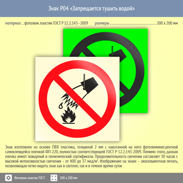 Знак P04 «Запрещается тушить водой» (фотолюминесцентный пластик ГОСТ 34428-2018, 200х200 мм) в Химках купить