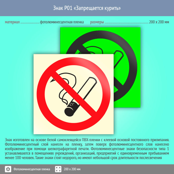 Знак P01 «Запрещается курить» (фотолюминесцентная пленка, 200х200 мм) в Химках купить