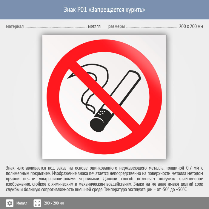 Знак P01 «Запрещается курить» (металл, 200х200 мм) в Химках купить