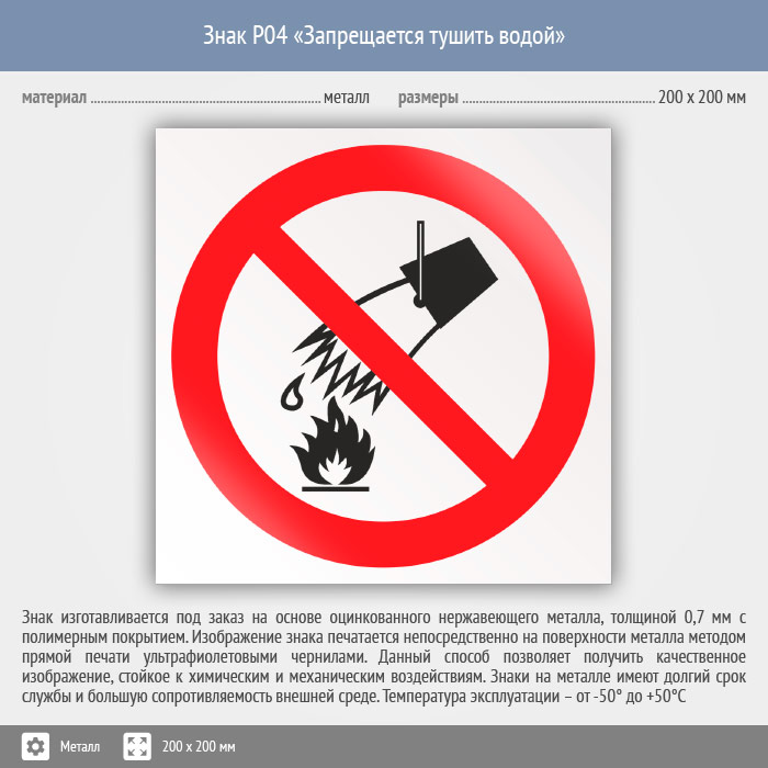 Знак P04 «Запрещается тушить водой» (металл, 200х200 мм) в Химках купить