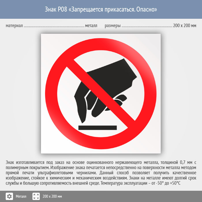 Знак P08 «Запрещается прикасаться. Опасно» (металл, 200х200 мм) в Химках купить