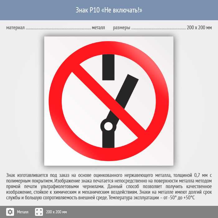 Знак P10 «Не включать!» (металл, 200х200 мм) в Химках купить