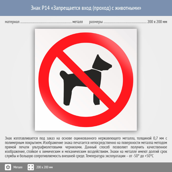 Знак P14 «Запрещается вход (проход) с животными» (металл, 200х200 мм) в Химках купить