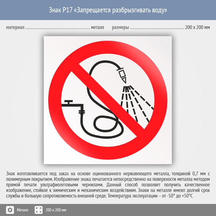 Знак P17 «Запрещается разбрызгивать воду» (металл, 200х200 мм) в Химках купить