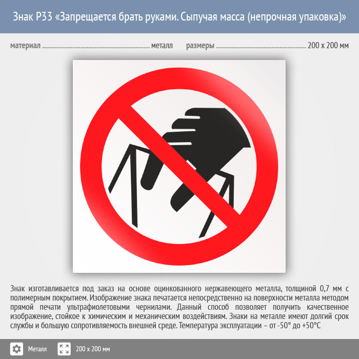 Знак P33 «Запрещается брать руками. Сыпучая масса (непрочная упаковка)» (металл, 200х200 мм) в Химках купить