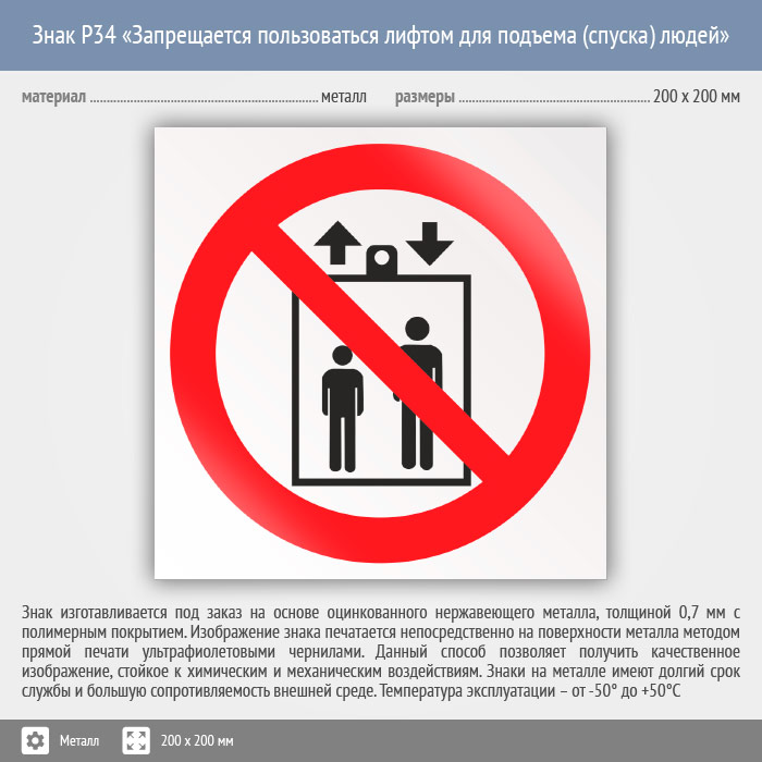 Знак P34 «Запрещается пользоваться лифтом для подъема (спуска) людей» (металл, 200х200 мм) в Химках купить