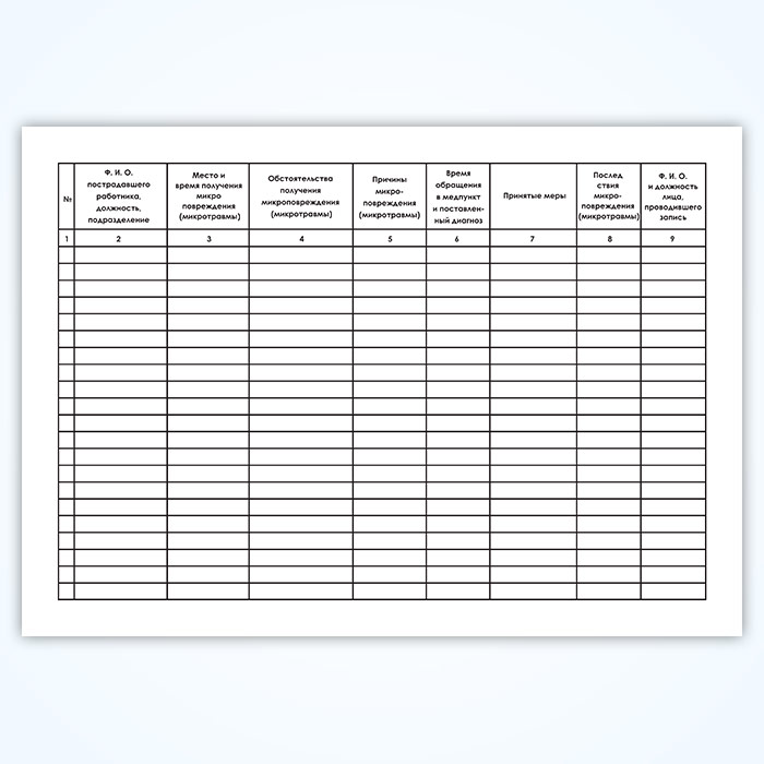 Журнал учета микроповреждений (микротравм) работников является учетным документом, предназначенным для регистрации случаев получения работниками микроповреждений (микротравм) в процессе трудовой деятельности. Микротравма — это повреждение, возникающее в результате воздействия небольших по интенсивности усилий, приводящее к нарушению функции и микроструктуры тканей (острая микротравма — однократное или непродолжительное превышение пределов прочности ткани, хроническая — многократное и длительное воздействие травмирующего агента).