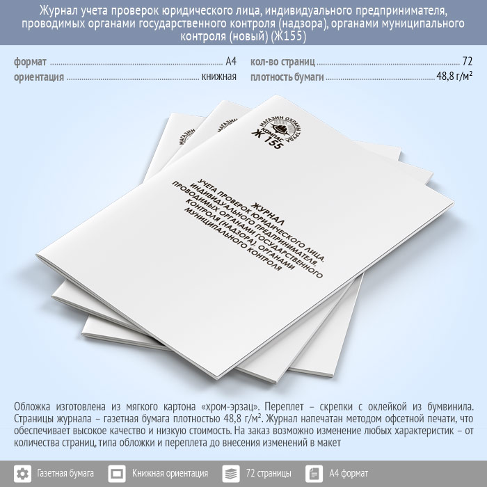 Журнал учета проверок юридического лица, индивидуального предпринимателя, проводимых органами государственного контроля (надзора), органами муниципального контроля (новый) (72 стр., Ж155) в Химках купить
