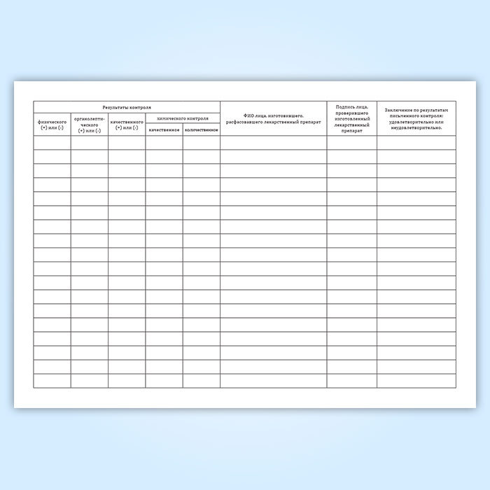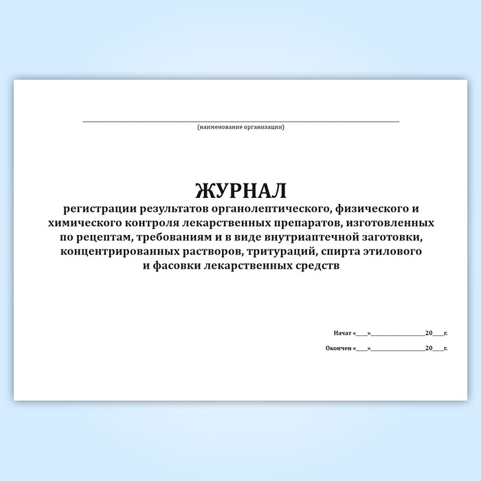 Журнал регистрации результатов органолептического, физического и химического контроля лекарственных препаратов, изготовленных по рецептам, требованиям и в виде внутриаптечной заготовки, концентрированных растворов, тритураций, спирта этилового и фасовки лекарственных средств в Химках купить