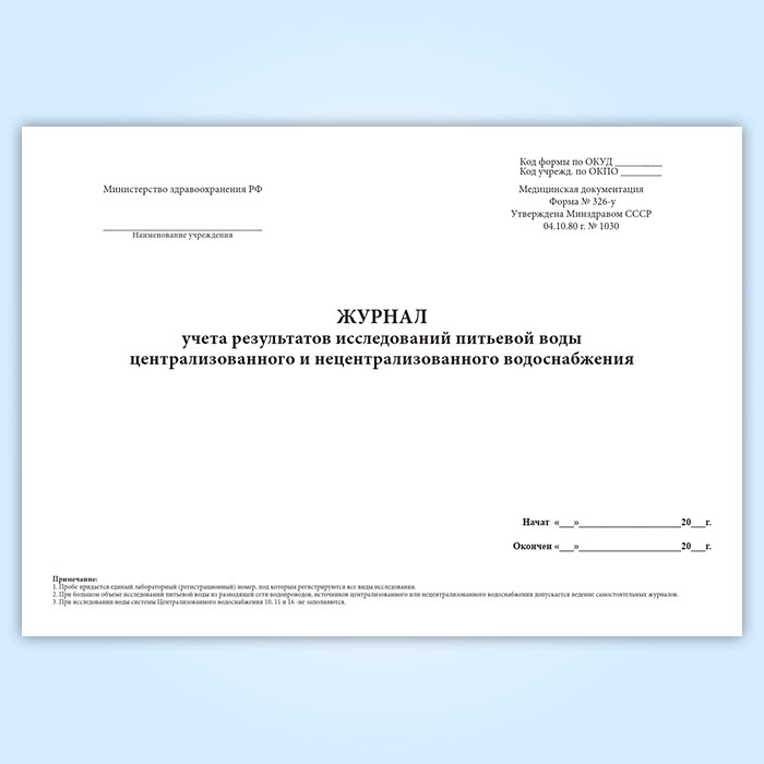 Журнал учета результатов исследований питьевой воды централизованного и нецентрализованного водоснабжения (форма 326-у) в Химках купить