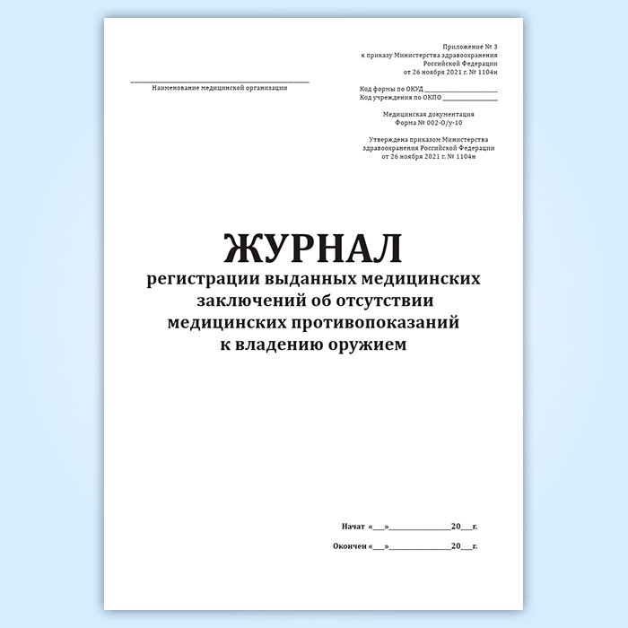 Журнал регистрации выданных медицинских заключений об отсутствии медицинских противопоказаний к владению оружием (форма 002-О/У-10) в Химках купить
