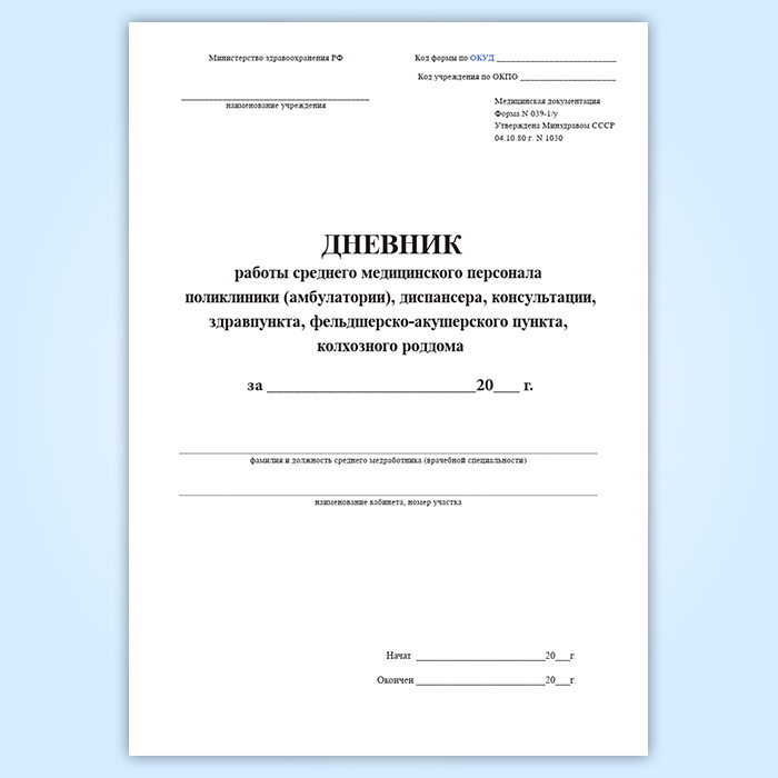 Дневник работы среднего медицинского персонала поликлиники (амбулатории), диспансера, консультации, здравпункта, фельдшерско-акушерского пункта, колхозного роддома (форма 039-1/у) в Химках купить