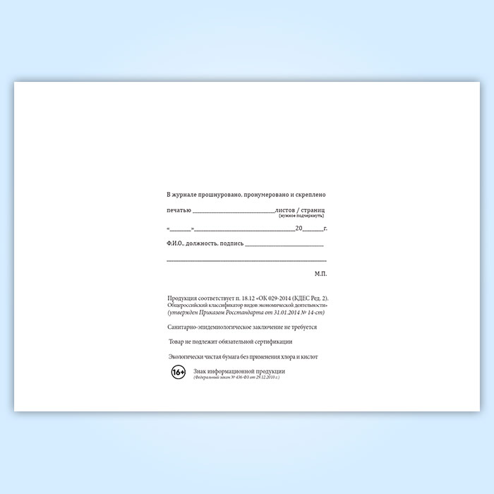Вы получаете печатную продукцию прошнурованной и c местом для вашей печати в соответствии с действующими нормативными документами: