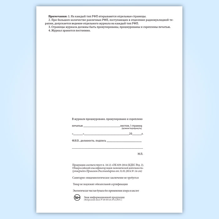 Приходно-расходный журнал учета радиофармпрепаратов, поступающих в подразделение радионуклидной терапии в готовом виде для непосредственного введения в организм пациента в Химках купить