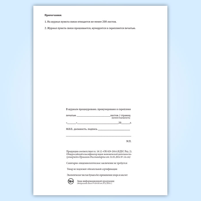 Вы получаете печатную продукцию прошнурованной и c местом для вашей печати в соответствии с действующими нормативными документами: