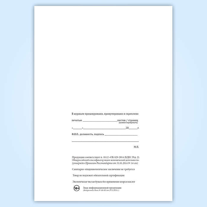 Вы получаете печатную продукцию прошнурованной и c местом для вашей печати в соответствии с действующими нормативными документами: