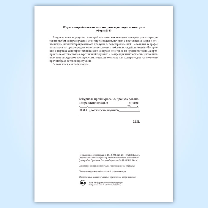 Журнал микробиологического контроля производства консервов (форма К-9) в Химках купить