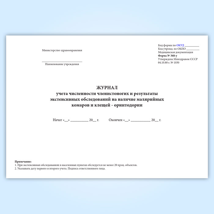 Журнал учета численности членистоногих и результаты экстенсивных обследований на наличие малярийных комаров и клещей - орнитодории (форма № 368-у) в Химках купить