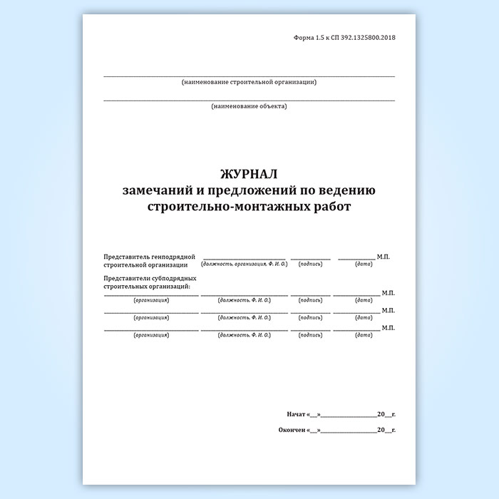 Журнал замечаний и предложений по ведению строительно-монтажных работ (форма 1.5, СП 392.1325800.2018) в Химках купить