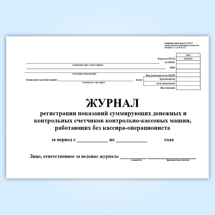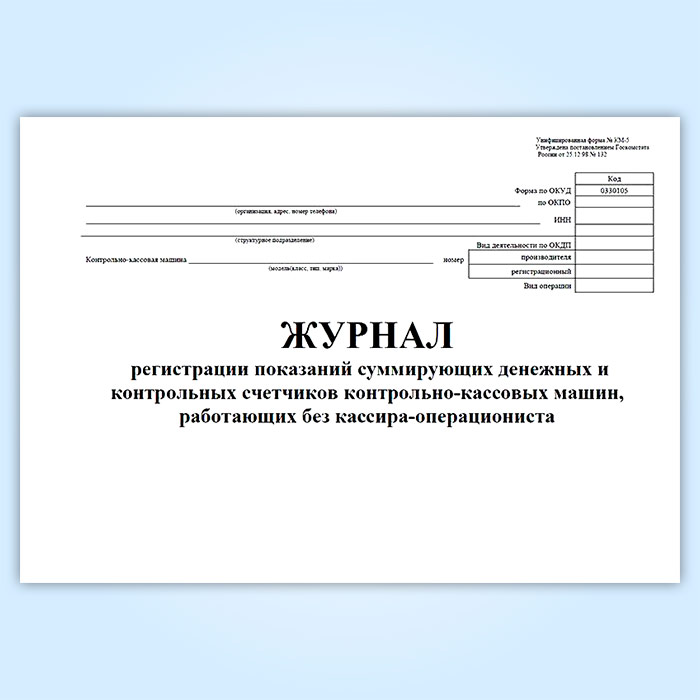 Журнал регистрации показаний суммирующих денежных и контрольных счетчиков контрольно-кассовых машин, работающих без кассира-операциониста (форма КМ-5) в Химках купить
