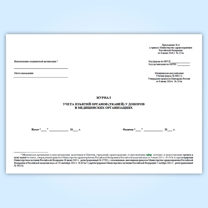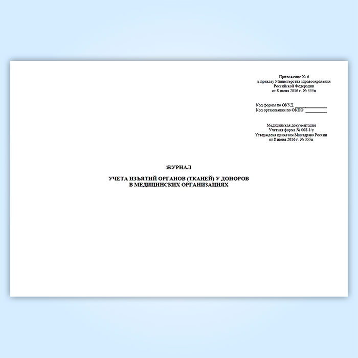 Журнал учета изъятий органов (тканей) у доноров в медицинских организациях (форма № 008-1/у) в Химках купить