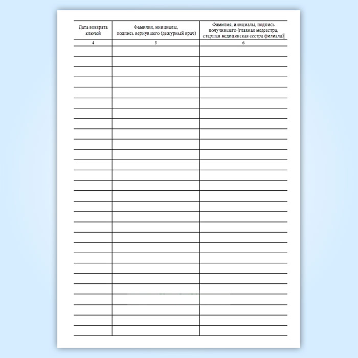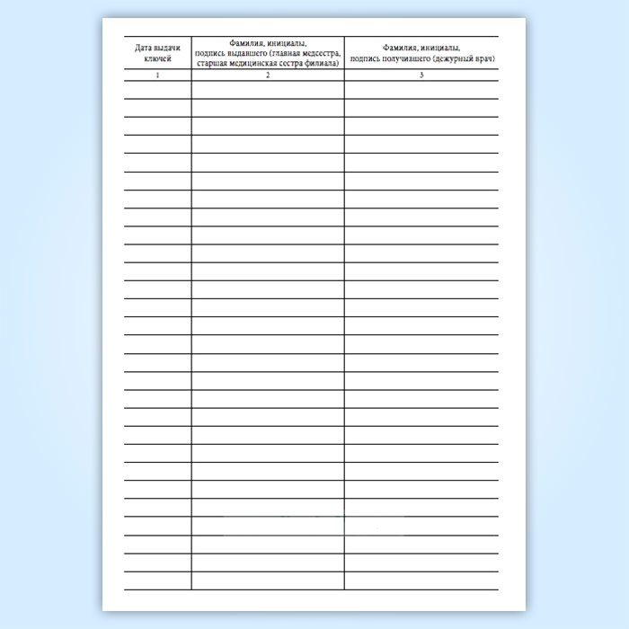 Журнал передачи ключей главной медсестры (старшей медицинской сестры филиала) дежурным врачам от помещения и сейфа, где проводятся операции, связанные с оборотом наркотических средств и психотропных веществ, в выходные и праздничные дни в амбулаторном отделении медицинской организации в Химках купить