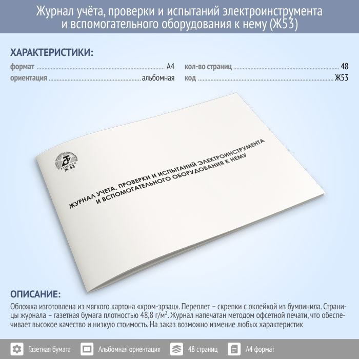 Журнал учета, проверки и испытаний электроинструмента и вспомогательного оборудования к нему (48 стр., Ж53) в Химках купить