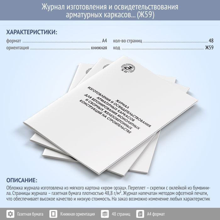 Журнал изготовления и освидетельствования арматурных каркасов для бетонирования монолитных и сборных железобетонных конструкций на строительстве (Ф-48) (48 стр., Ж59) в Химках купить