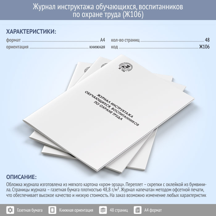 Журнал инструктажа обучающихся, воспитанников по охране труда (48 стр., Ж106) в Химках купить