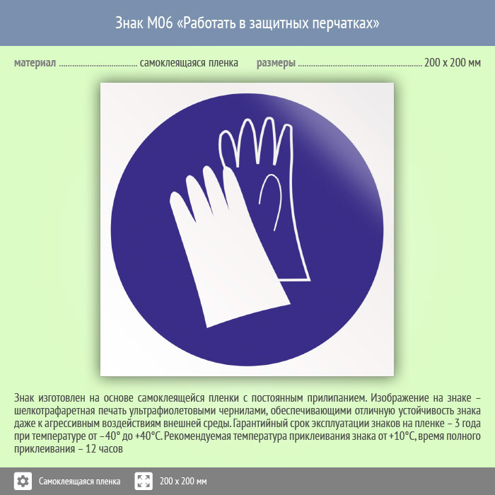 Знак «Работать в защитных перчатках» имеет размер 200х200 мм