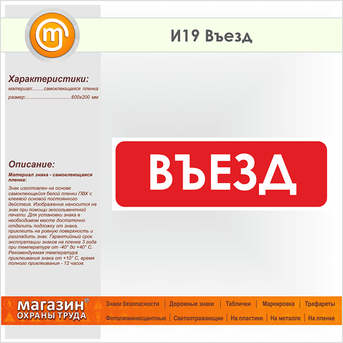 Знак «Въезд» может быть изготовлен любого размера на самоклеящейся пленке, пластике толщиной 0.5, 2 или 4 мм и металле. Также возможно применение фотолюминесцентных и световозвращающих материалов