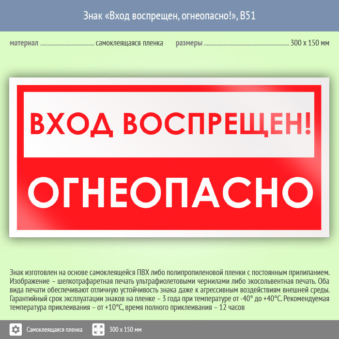 Знак «Вход воспрещен, огнеопасно!», B51 (пленка, 300х150 мм)