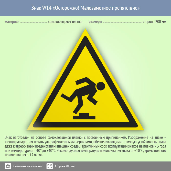 Знак W14 «Осторожно! малозаметное препятствие» (пленка, сторона 200 мм)