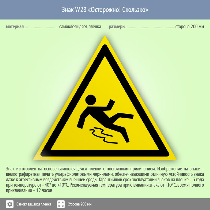 Знак «Осторожно! Скользко» предупреждает человека о скользкой поверхности, что он был внимательнее. Код знака: W28
