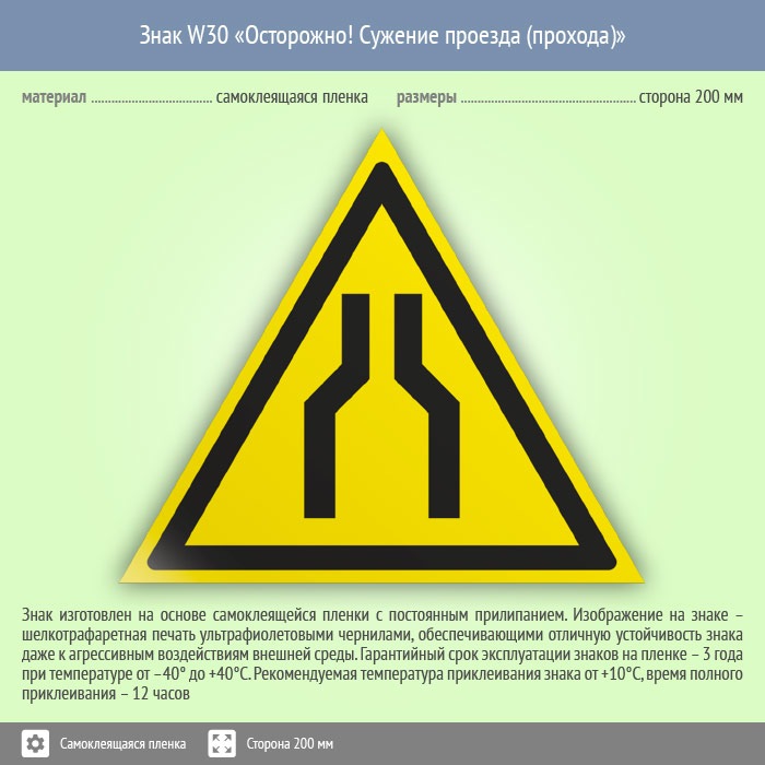 Знак W30 «Осторожно! сужение проезда (прохода)» (пленка, сторона 200 мм)
