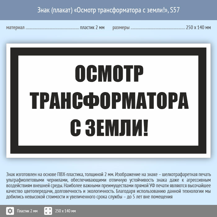 Знак (плакат) «Осмотр трансформатора с земли!», S57 (пластик, 250х140 мм) в Химках купить