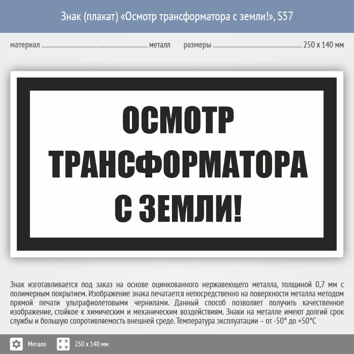 Знак (плакат) «Осмотр трансформатора с земли!», S57 (металл, 250х140 мм) в Химках купить