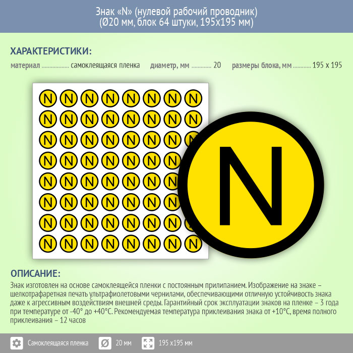 Знак (плакат) «N» (нулевой рабочий проводник), S47 (пленка, диаметр 20 мм, блок 64 штуки, 195х195 мм) в Химках купить
